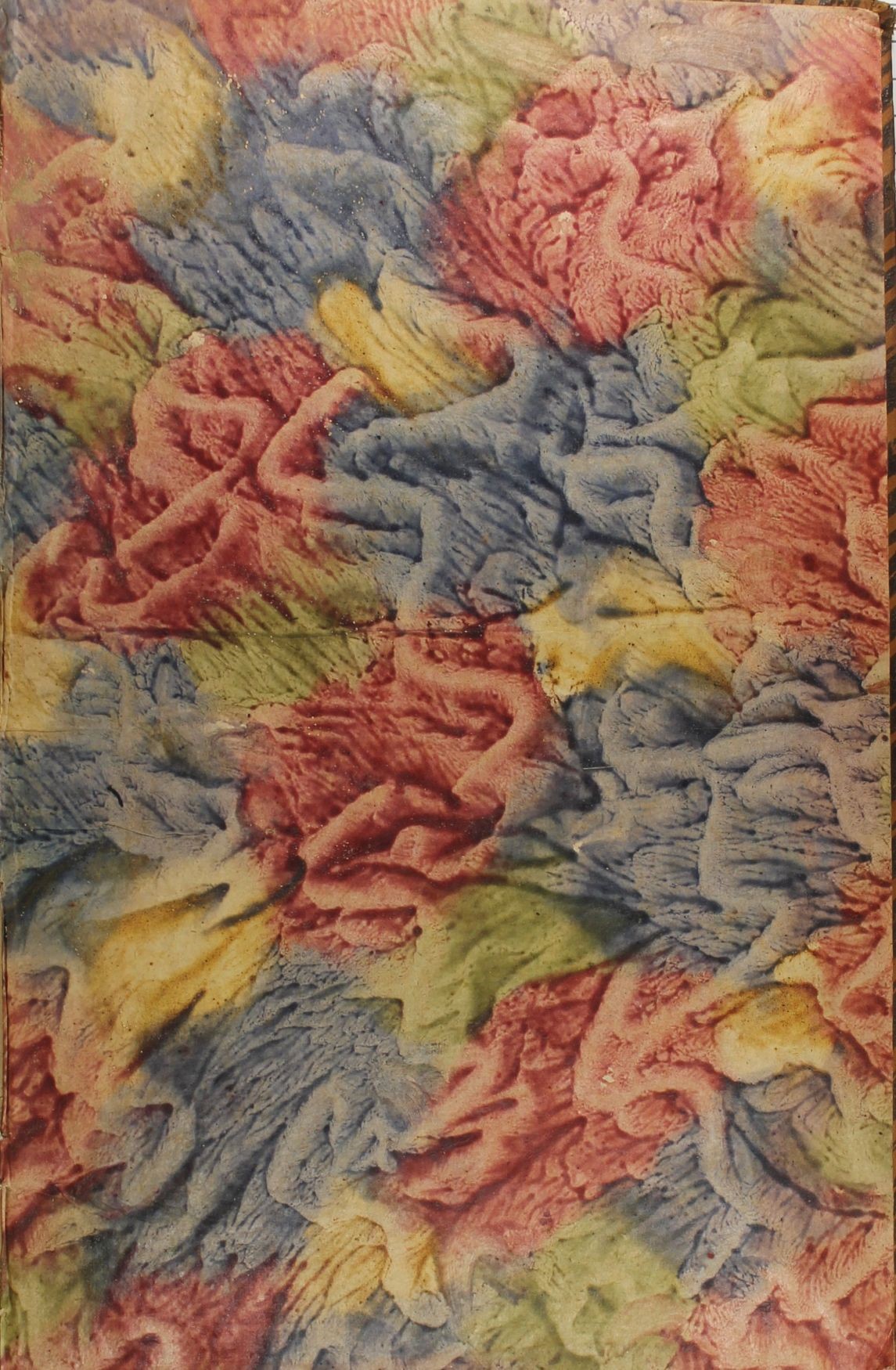Il volume presenta applicati ai risguardi due carte a colla spugnate policrome. Il particolare motivo è stato realizzato applicando al foglio delle chiazze di colore rossa, blu, giallo e verde tamponando con una spugna, in seguito ill foglio è stato fatto combaciare con un altro ad entrambi è stata applicata una pressione con una stecca che ha lasciato i segni visibili.