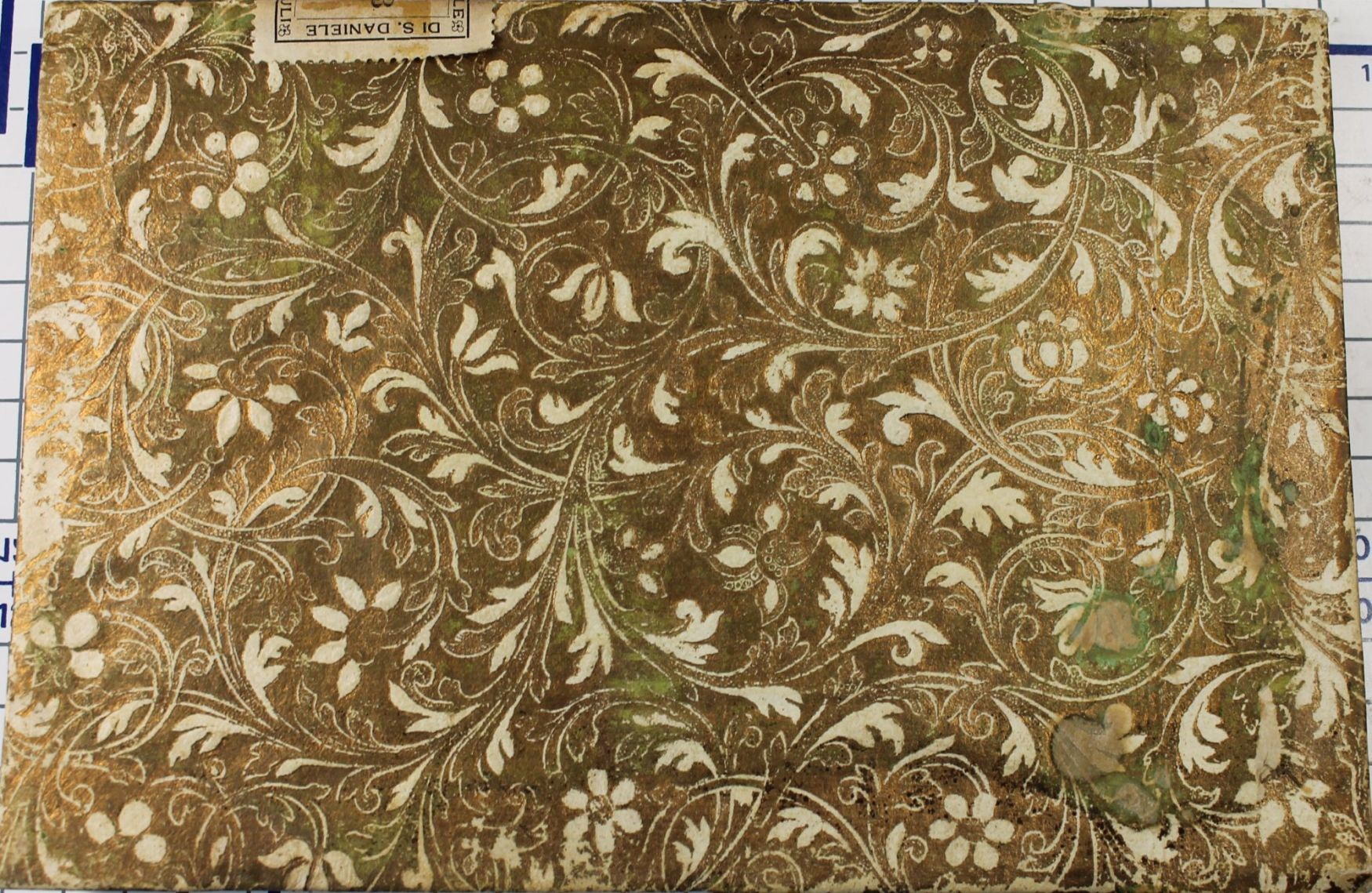 La carta presenta un motivo a ramages intervallati da fiori di diverse tipologie. E’ stata realizzata attraverso la tecnica della goffratura, come è deducibile dal rilievo del decoro. Nel catalogo la carta n. 5 presenta lo stesso disegno e su di essa è impresso il nome Stoy, stampatore attivo a Augsburg dal 1703 al 1750. Si presumo dunque la provenienza tedesca e lo si colloca nella prima metà del XVIII secolo.