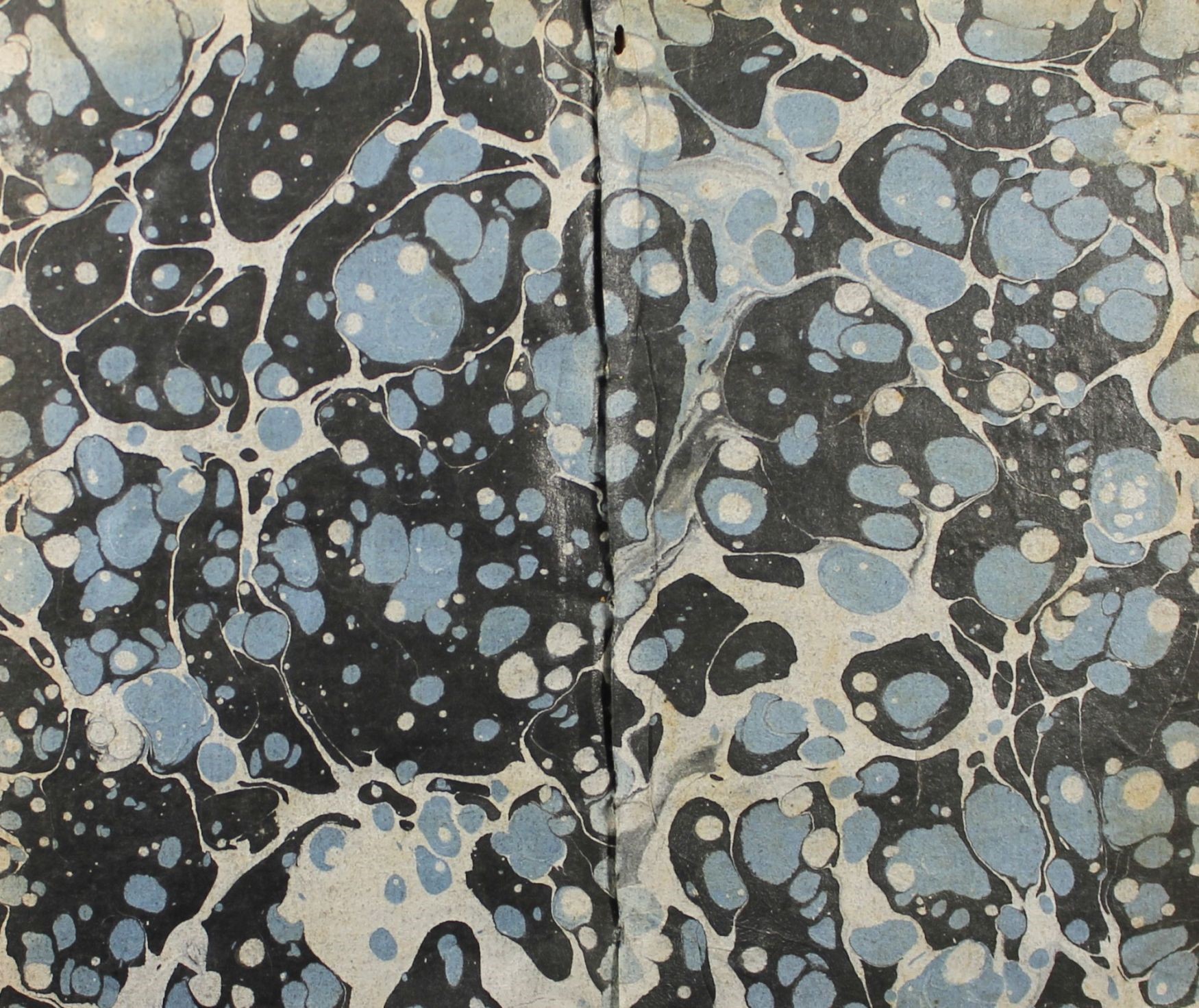 La carta presenta un motivo caillouté. Vi sono presenti grande macchie di colore nero, azzurro e bianco che creano un motivo che ricorda la screziatura del marmo. Risulta difficile collocare la produzione della carta in un determinato ambito, si ipotizza sia stata realizzata al momento della legatura del volume all’inizio del XIX secolo.