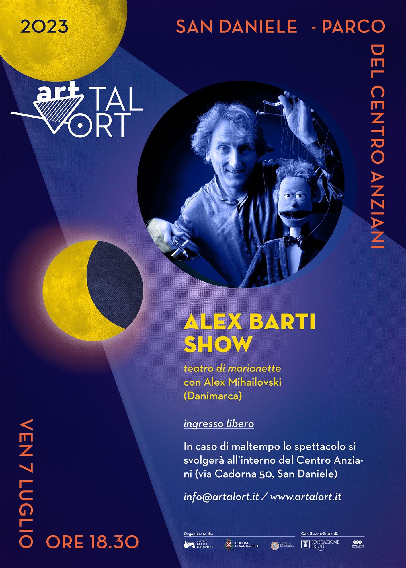 Art tal Ort 2023 fa tappa a San Daniele presso il Parco del Centro Anziani, venerdì 7 luglio 2023 alle 18.30, con lo spettacolo ALEX BARTI SHOW, teatro di marionette con Alex Mihailovski.