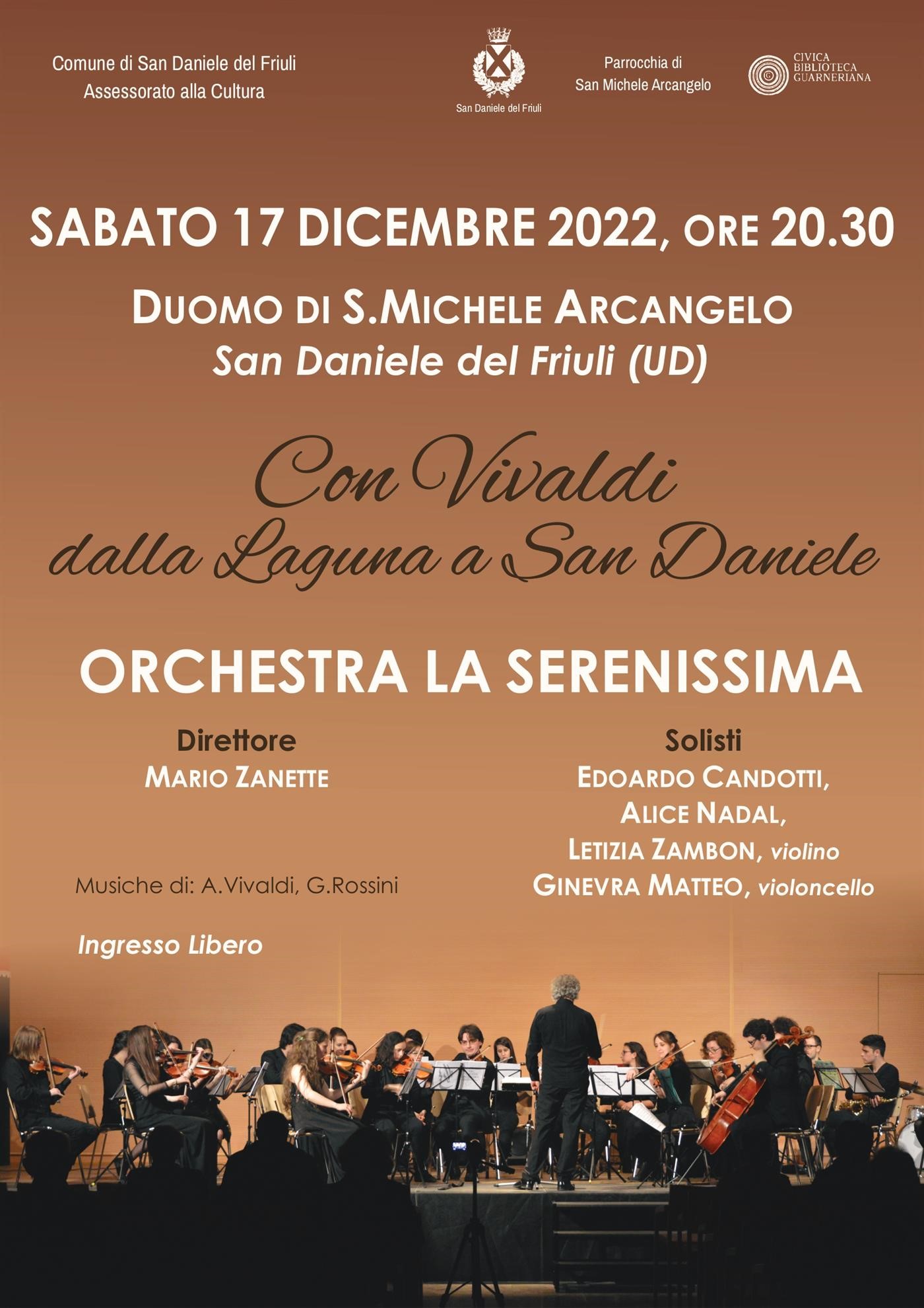 L’amministrazione comunale di San Daniele è lieta di invitarvi, sabato 17 dicembre 2022 alle ore 20.30 presso il Duomo di San Michele Arcangelo, al concerto di Natale a cura dell’Orchestra La Serenissima: Con Vivaldi dalla Laguna a San Daniele.
