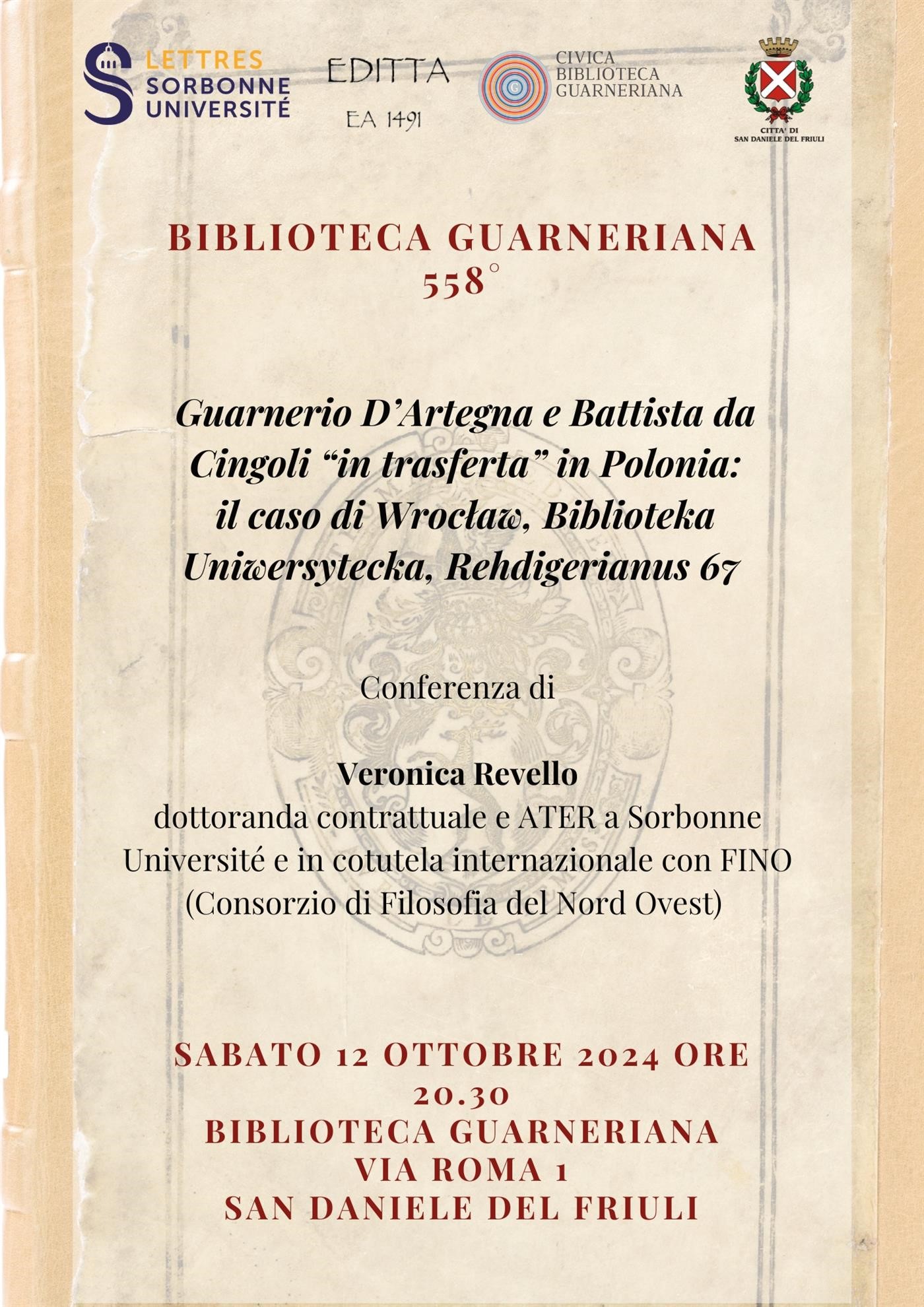 Nel 2019 è stato identificato un manoscritto inedito della tradizione filosofica ciceroniana: Wrocław (Polonia), Biblioteka Uniwersytecka, Rehdigerianus 67. Nel corso della serata verrà esaminato il metodo paleografico-codicologico che ha permesso di ricostruire la storia del manoscritto e di stabilire che esso è stato trascritto tra il 1458 e il 1461, su richiesta di Guarnerio d’Artegna, dal copista di professione Battista da Cingoli a San Daniele del Friuli.