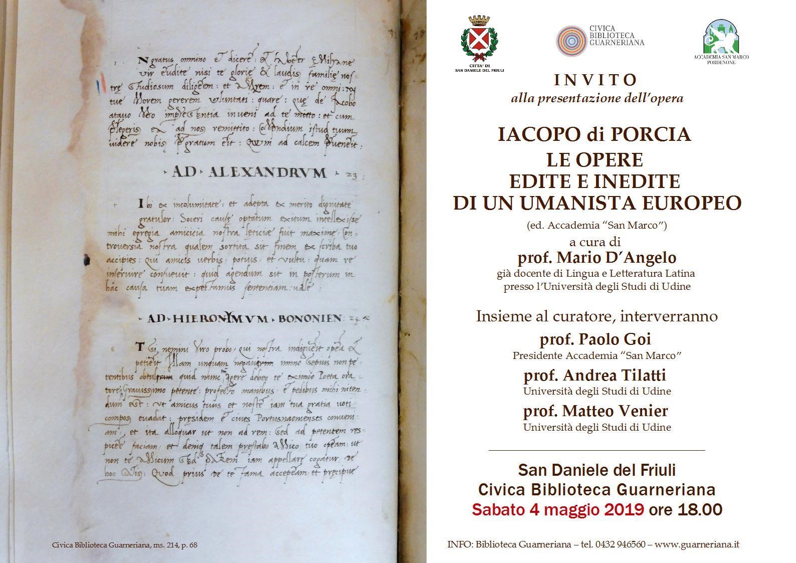 Presentazione del volume "Iacopo di Porcia. Le opere edite e inedite di un umanista europeo" (ed. Accademia San Marco), a cura di Mario D'Angelo, già docente di Lingua e Letteratura Latina presso l’Università degli Studi di Udine.