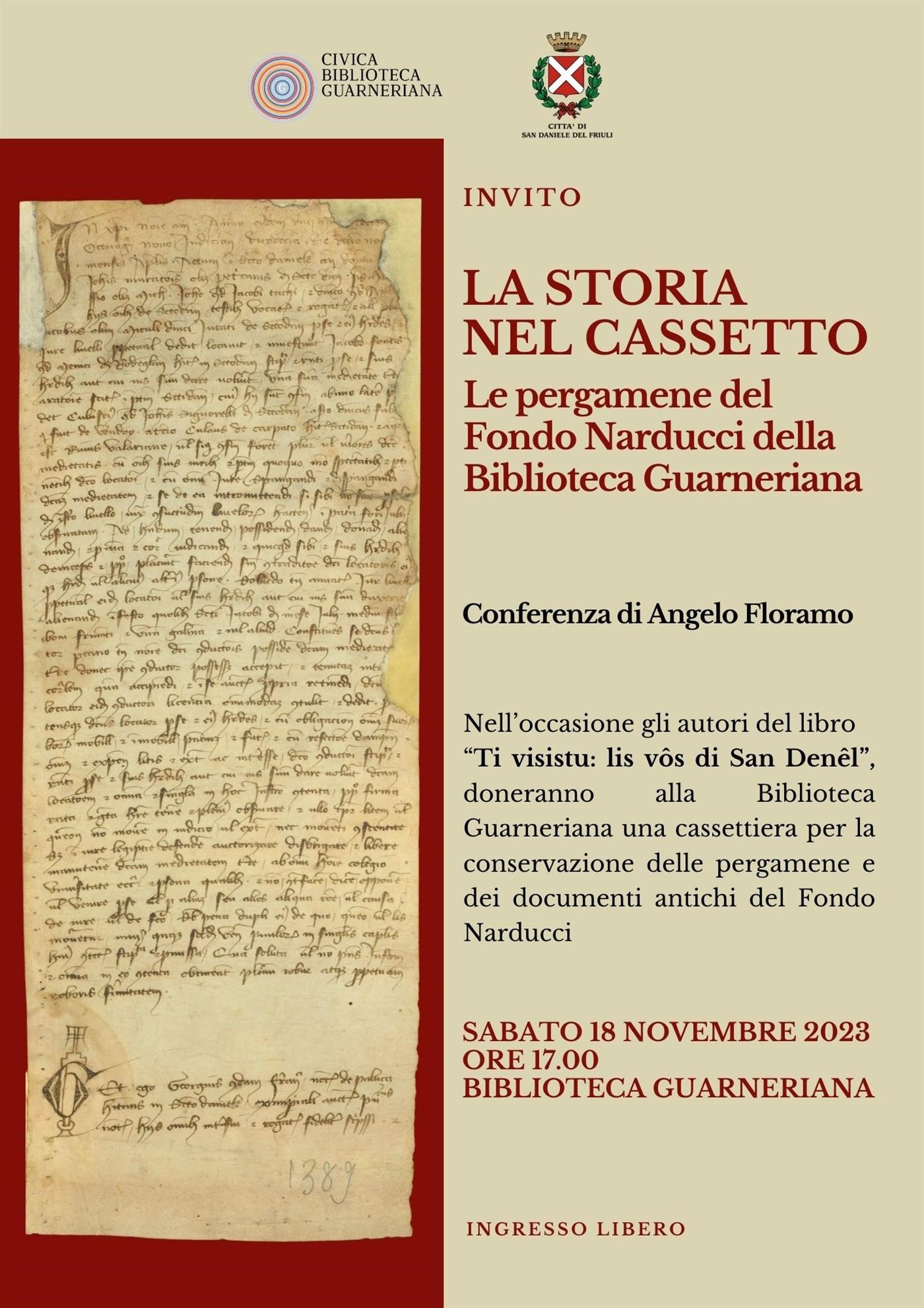 Nell’occasione gli autori del libro Ti visistu: lis vôs di San Denêl, doneranno alla Biblioteca Guarneriana una cassettiera per la conservazione delle pergamene e dei documenti antichi del Fondo Narducci.