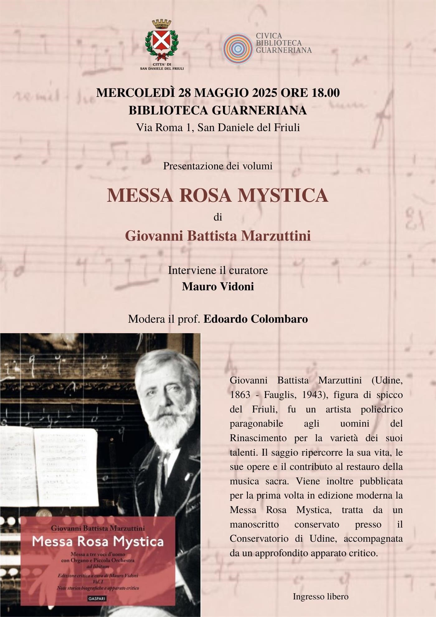 Mercoledì 28 maggio 2025 alle ore 18.00 in Biblioteca Guarneriana, verranno presentati i libri Messa Rosa Mystica (Gaspari editore) di Giovanni Battista Marzuttini, a cura di Mauro Vidoni.