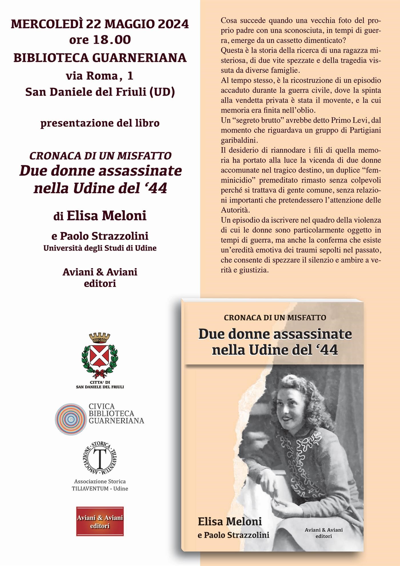 Mercoledì 22 maggio 2024 alle ore 18.00 in Biblioteca Guarneriana, verrà presentato il libro Cronaca di un misfatto. Due donne assassinate nella Udine del '44 (Aviani&Aviani Editori) di Elisa Meloni e Paolo Strazzolini (Università degli Studi di Udine).