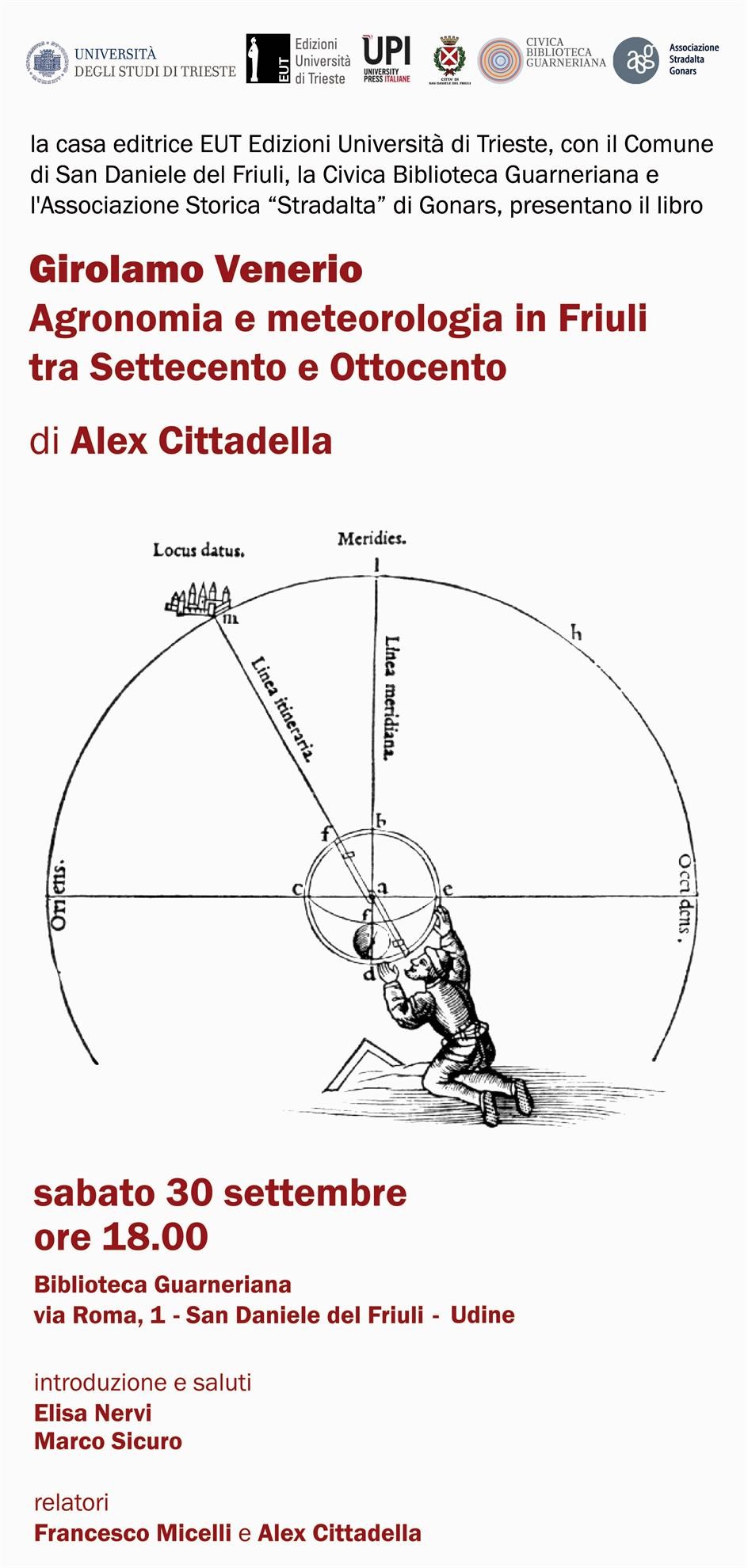 La casa editrice EUT Edizioni Università di Trieste, con il Comune di San Daniele del Friuli, la Civica Biblioteca Guarneriana e l'Associazione Storica "Stradalta" di Gonars, nel ricorrerere del 240° anniversario dalla sua nascita, presentano il libro "Girolamo Venerio. Agronomia e meteorologia in Friuli tra Settecento e Ottocento" di Alex Cittadella.
