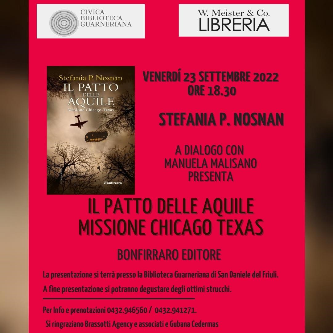 Venerdì 23 settembre 2022 alle ore 18.30 in Biblioteca Guarneriana, la scrittrice Stefania P. Nosnan presenterà il suo ultimo libro Il patto delle aquile: missione Chicago Texas (Bonfirraro editore).