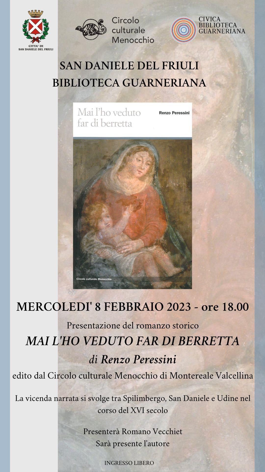 Mercoledì 8 febbraio 2023 alle ore 18.00 in Biblioteca Guarneriana, Renzo Peressini presenta il suo romanzo storico Mai l'ho veduto far di berretta (Circolo culturale Menocchio).