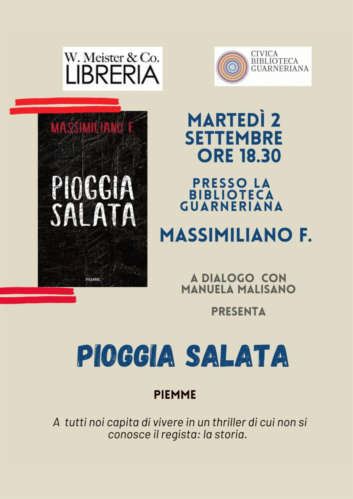 Martedì 2 settembre 2025 alle ore 18.30 verrà presentato il libro Pioggia salata (Piemme) di Massimiliano F.