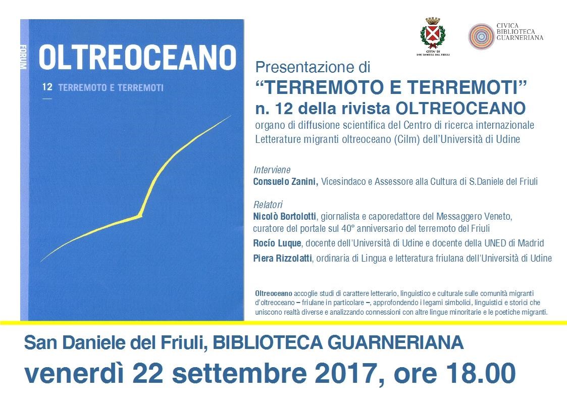 In occasione del quarantesimo anniversario del terremoto che colpì il Friuli nel 1976, la rivista Oltreoceano ha dedicato infatti il suo dodicesimo numero alle implicazioni emotive e artistiche dell’evento sismico – del disastro naturale come trauma individuale e del tessuto sociale coinvolto –, così come appaiono nello specchio della produzione letteraria di alcuni fra gli spazi culturali ordinariamente o episodicamente coinvolti dal fenomeno, nel passato e nell’attualità: il Friuli, la Romania e le Americhe.