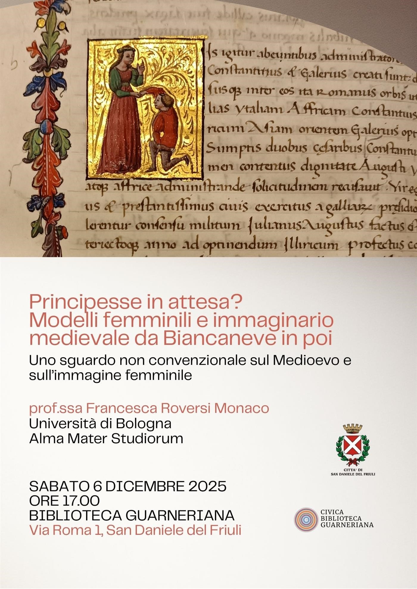 Sabato 6 dicembre 2025, alle ore 17.00, nella Biblioteca Guarneriana si terrà l’incontro con la prof.ssa Francesca Roversi Monaco (Università di Bologna, Alma Mater Studiorum), che presenterà la conferenza “Principesse in attesa? Modelli femminili e immaginario medievale da Biancaneve in poi”.