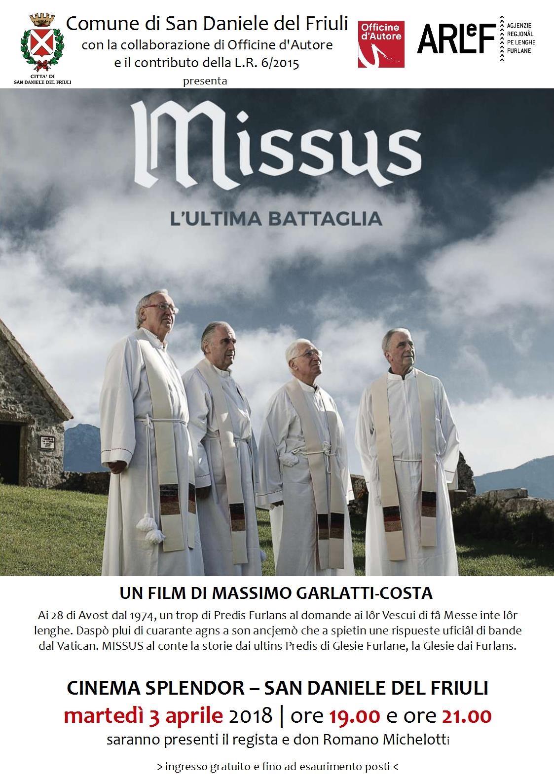 In occasione delle celebrazioni per la Festa della Patria del Friuli, incollaborazione con l'Associazione Officine d'Autore, il Comune di San Daniele organizza una nuova doppia proiezione di "MISSUS. L'ultima battaglia", un film del registra friulano Massimo Garlatti-Costa.