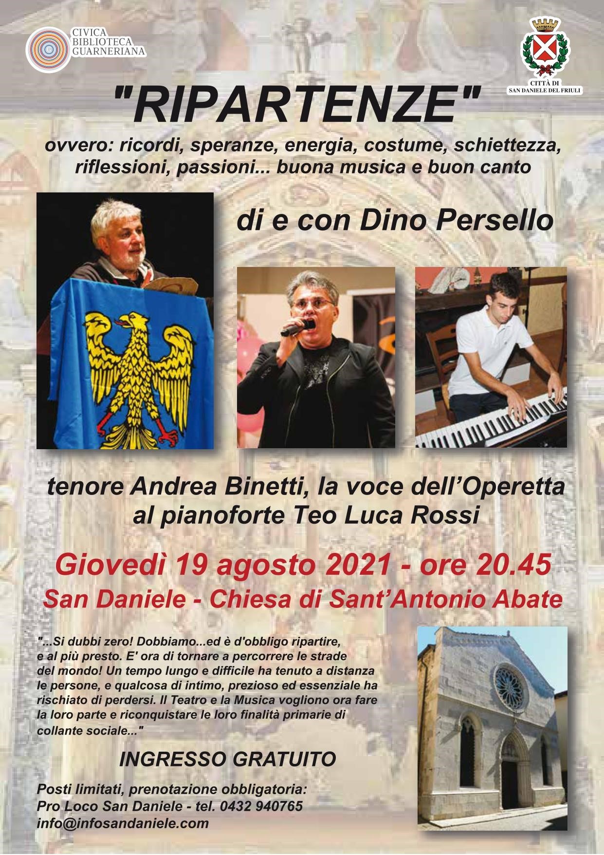 "Ripartenze" ovvero ricordi, speranze, energia, costume, schiettezza, riflessioni, passioni, buona musica e buon canto, di e con Dino Persello accompagnato dal tenore Andrea Binetti, la voce dell'Operetta e al pianoforte Teo Luca Rossi.