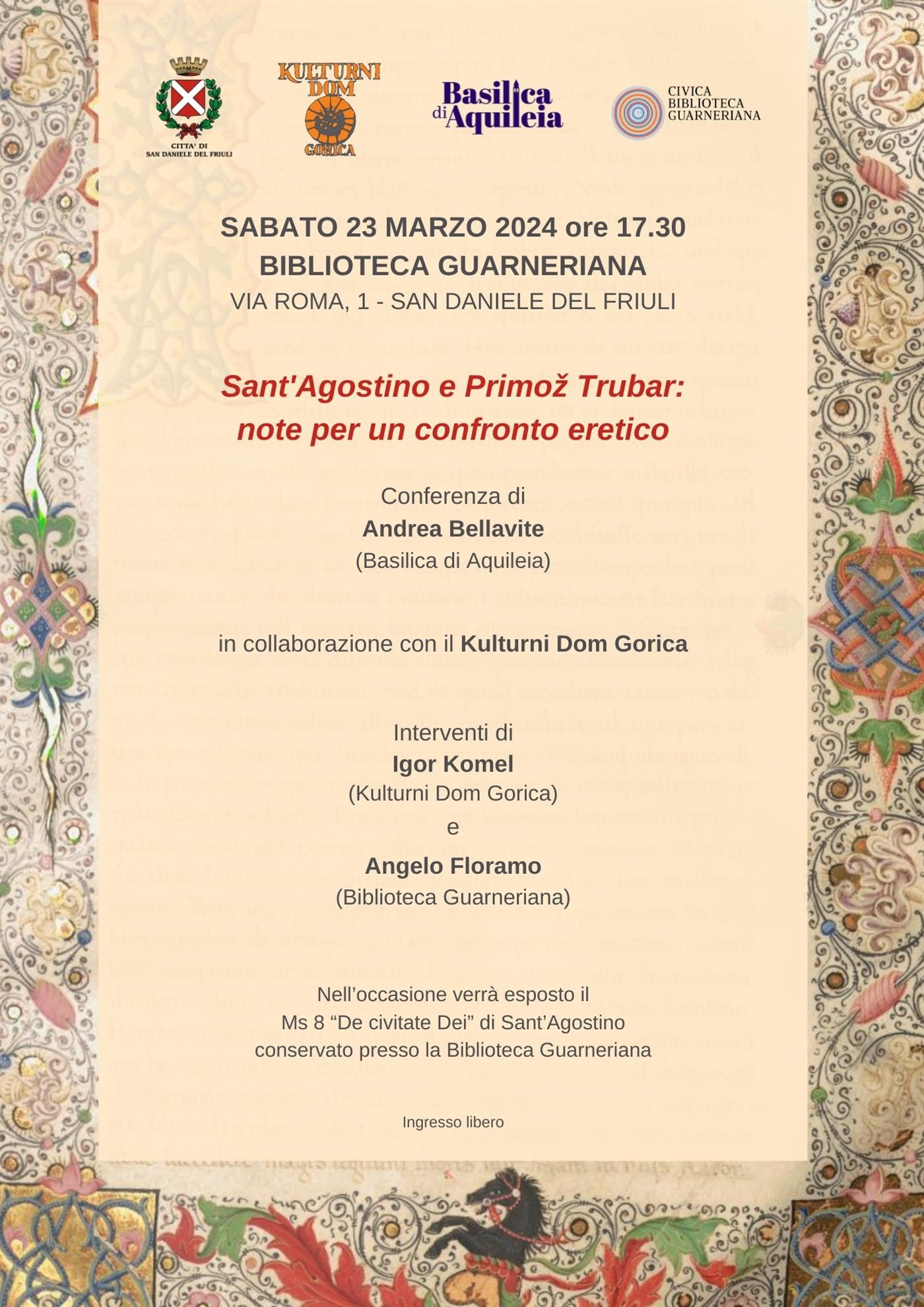 Sabato 23 marzo 2024 alle ore 17.30 in Biblioteca Guarneriana, si terrà la conferenza Sant'Agostino e Primož Trubar: note per un confronto eretico di Andrea Bellavite (Basilica di Aquileia), in collaborazione con il Kulturni Dom Goriza.