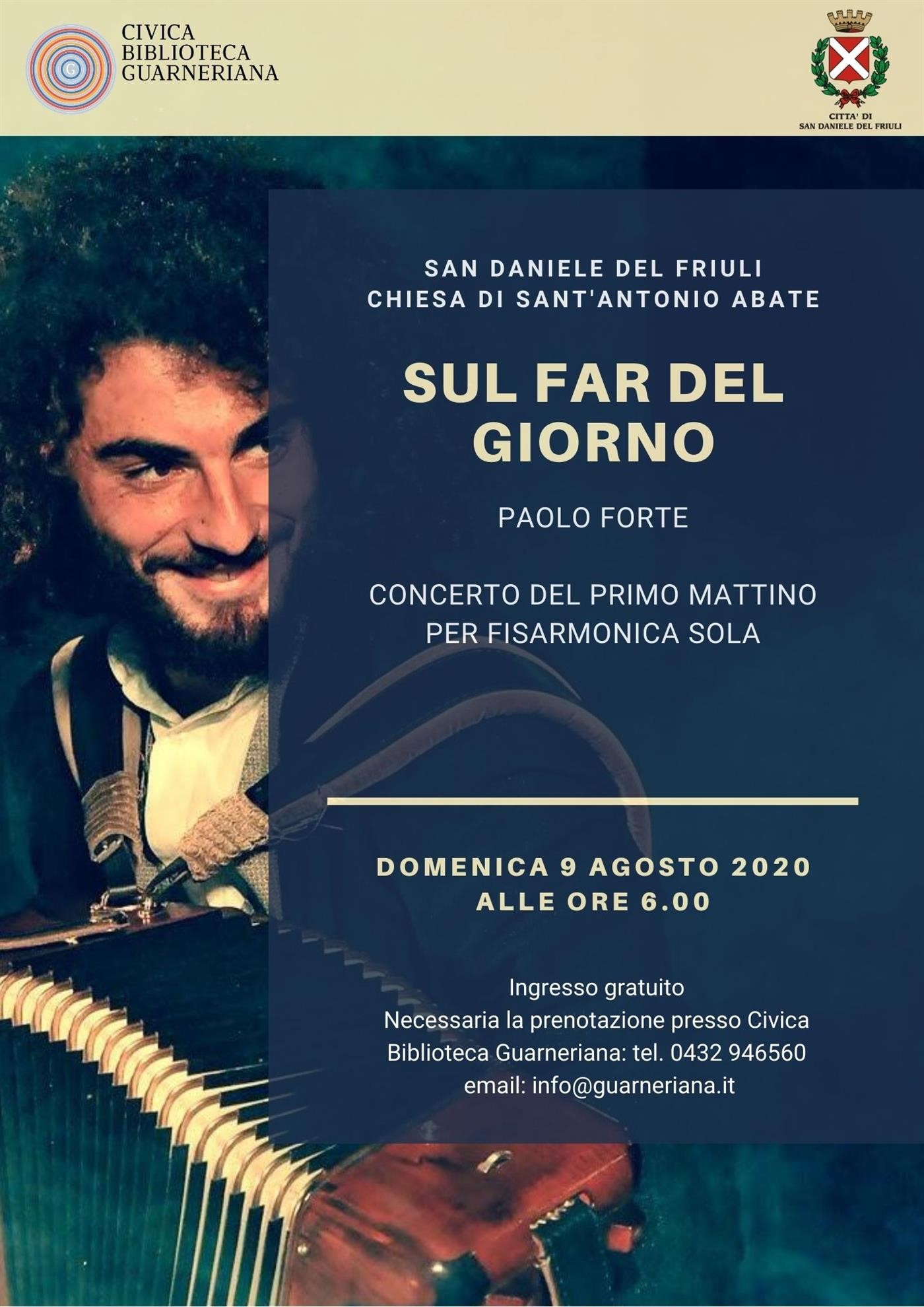 Un concerto di primo mattino nella Chiesa di Sant'Antonio Abate, l'antica chiesa della omonima Confraternita la cui missione principale per secoli è stata quella di accogliere e sostenere pellegrini, poveri, malati. Ai piedi dei meravigliosi affreschi di Pellegrino da San Daniele, accolti nel grembo di questo luogo suggestivo, incominceremo un nuovo giorno con la musica potente e intensa della fisarmonica di Paolo Forte.