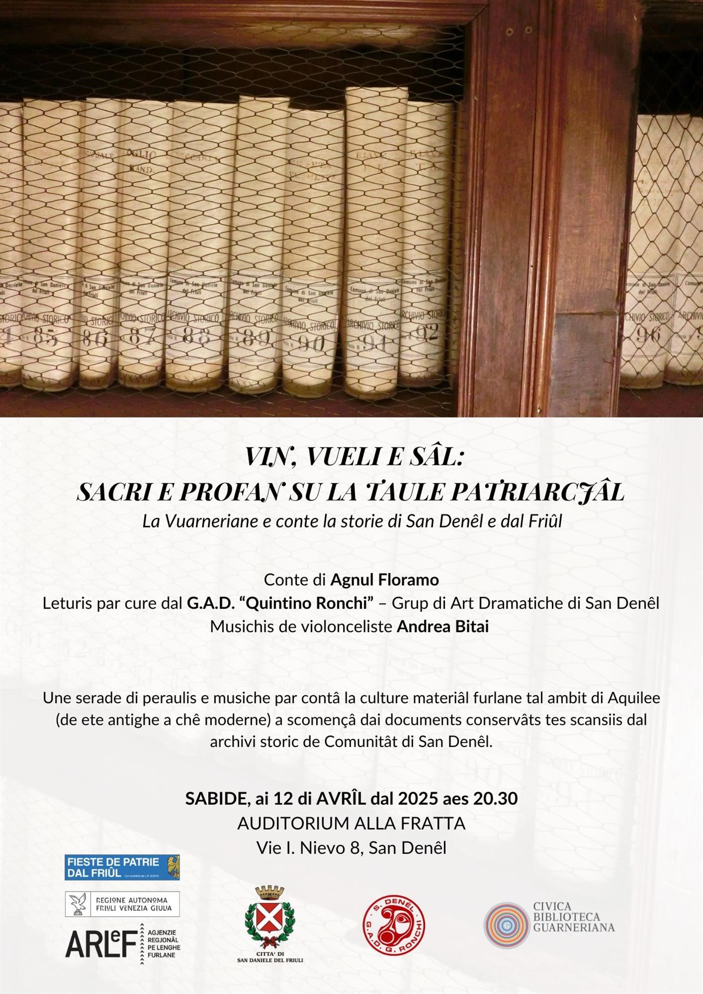 In occasione delle celebrazioni per la Festa della Patria del Friuli, che ricorre il 3 aprile, SABATO 12 APRILE 2025 alle ore 20.30 presso l'Auditorium alla Fratta si terrà una serata di parole e musica per raccontare la cultura materiale friulana in ambito aquileiese (dal Tardo Antico all'Evo Moderno) partendo dai documenti conservati tra gli scaffali dell'Archivio storico della Comunità di San Daniele del Friuli.