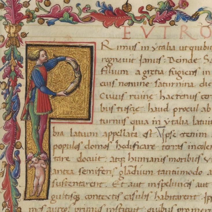 l’eleganza e l’originalità delle sue lettere iniziali finemente decorate, formate da figure con abiti d’epoca a colori tenui, su lamina dorata con motivi vegetali in rilievo: un codice che disvela il gusto, tutto umanistico, per la bellezza e il convincimento che la cultura può essere una splendida occasione per divertirsi e stuzzicare l’intelligenza dell’uomo, fulcro dell’universo e misura di tutte le cose.