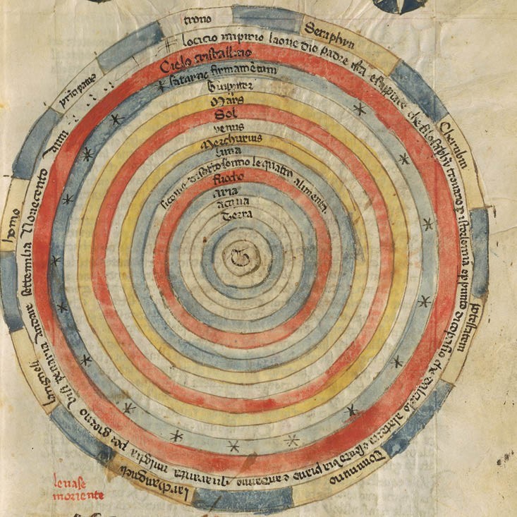 carta 53 recto, a rappresentare l'Universo come lo si immaginava ai tempi di Dante, in forma geocentrica, con la Terra al centro di ogni sfera celeste.